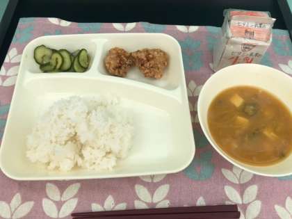 今日の献立表、豚肉の竜田揚げ、味噌汁、キュウリの甘酢漬け、牛乳です。いただきます。