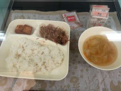今日の献立は、豚肉ともやしの炒め物、すまし汁、厚揚げの生姜醤油かけ、ご飯、牛乳です。いただきます。