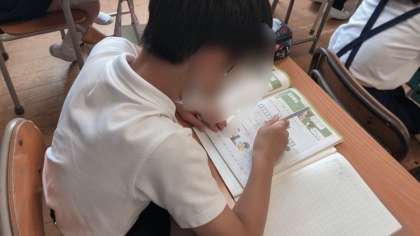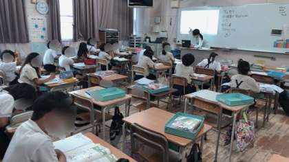 3年生の様子です。算数の学習でした。暗算で計算して、答えを教科書に書き込んでいました。休んでいる子はオンラインで授業を受けています。