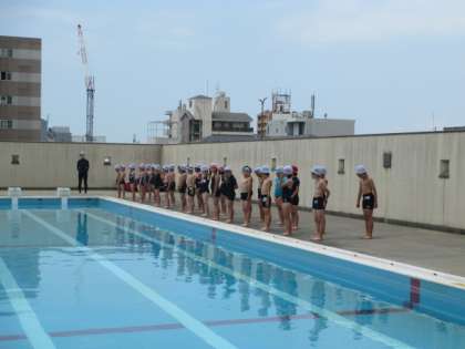 びっくりする1年生。2年生は、さすがです。てきぱきバスタオルをバーにかけ、バディを組んで並びます。