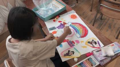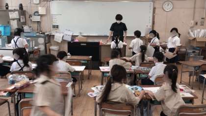 1年生の様子です。図工の学習でパスを使って絵を描いていました。出来たら、先生にみてもらいます。