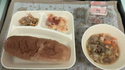 今日の献立は、鶏肉とてぼ豆のスープ煮、じゃがいもとトマトのチーズ焼き、もやしとコーンのソテー、おさつパン、牛乳です。今学期最後の給食です。しっかりいただいて、午後からも元気に頑張りましょう。