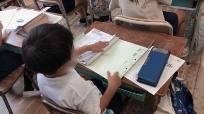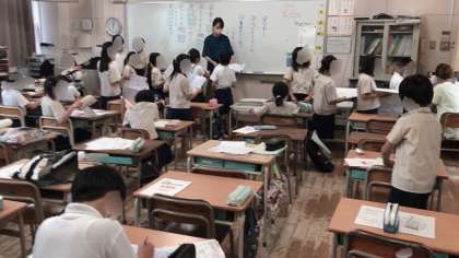 3年生の様子です。1学期に取り組んだテストやプリントなどを整理していました。全部できていないところややり直しのところなどをきちんとやって先生に確認してもらって、ファイルに綴じていきます。