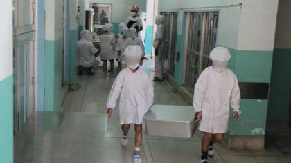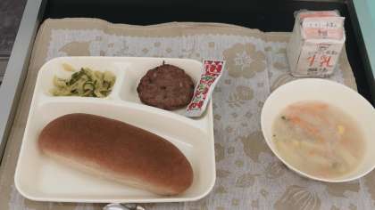 今日の献立は、焼きハンバーグ、豆乳スープ、キャベツとピーマンのカレーソテー、黒糖パン、牛乳です。