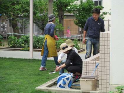 先日、3年生が「お花の学校」で植えてきた苗をプランターに植え替える作業を、3年生と地域、はぐくみのみなさんでしました。