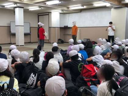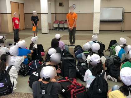 多目的室で開舎式がしました。お世話になる宿舎の方のお話を静かに聴いて、よろしくお願いしますのあいさつもしっかりできました。