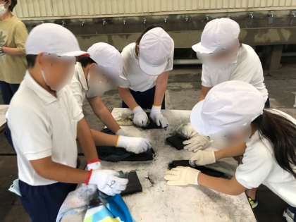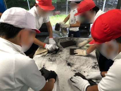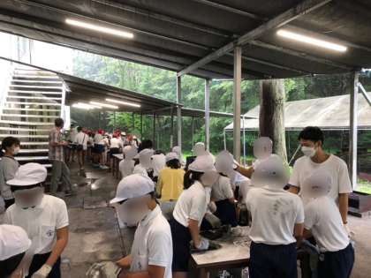 次のプログラム、焼き板工作に入りました。焦がした板を布で磨きます。木の目を活かして光沢がでるようにしっかり磨きましょう。