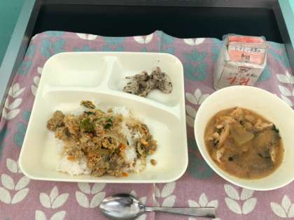 今日の献立は、他人丼、冬瓜の味噌汁、キャベツの赤紫蘇和え、牛乳です。いただきます。