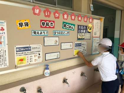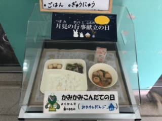 今日は行事献立(お月見)です。一口がんもとサトイモの味噌煮、牛肉と野菜の炒め物、みたらし団子、ご飯、牛乳です。お月見のお団子としてみたらし団子が出ています。よく噛んでいただきましょう。今回の給食室前の掲示は、朝食についてクイズ形式で学べる内容になっています。