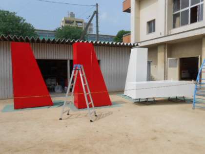 昨年までの入退場門は白地でした。赤白に分けているのですから門も赤白にしようと色をぬりました。あとは字を入れるだけとなりました。