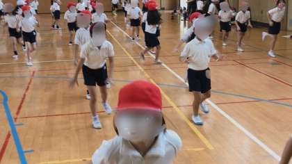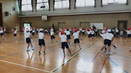 運動会の集団演技の練習です。音楽に合わせてリズムよく踊れるように頑張って練習していました。