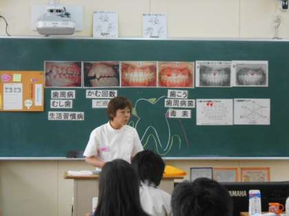 毎年、6年生を対象にして「歯と口の健康教室」が実施されます。永久歯を大事にする心を育てます。