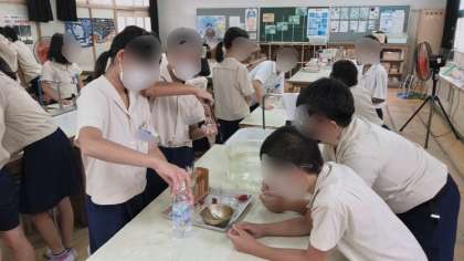 気体の実験です。先生の指示実験を見てから同じ手順で実験していきます。