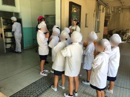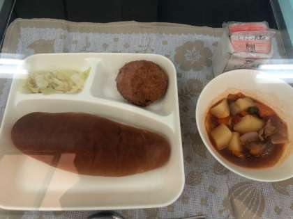 今日の献立は、チキンレバーカツ、ケチャップ煮、キャベツのバジル風味サラダ、黒糖パン、牛乳です。いただきます。