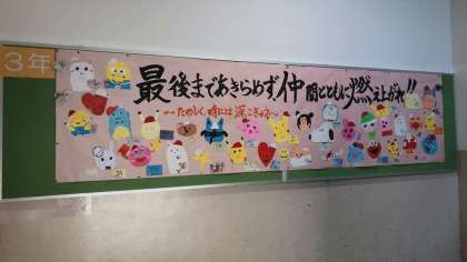 2号階段にある3年生の掲示板に貼ってある学級作品です。運動会のスローガンをそれぞれの好きなキャラクターで囲んでいます。みんなで運動会がんばろうという気持ちを込めました。