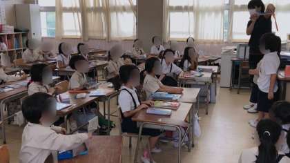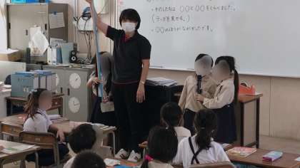 算数で、教室にあるいろんな物の長さをテープを使って測り、比べる学習でした。みんなの前に立って「私たちは本棚とロッカーの長さを比べました。本棚の方が長かったです。」としっかり発表していました。
