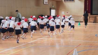 運動会のかけっこの練習です。並び方や入場からスタート位置まで進む仕方などを確かめていました。
