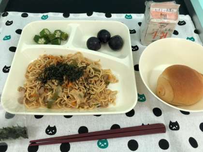 今日の献立は、焼きそば、オクラの甘酢和え、ブドウ(巨峰)、黒糖ロールパン、牛乳です。いただきます。