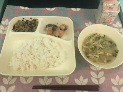 今日の献立は、鮭のつけ焼き、五目汁、高野豆腐のいり煮、ご飯、牛乳です。いただきます。
