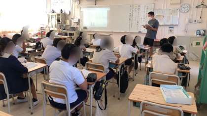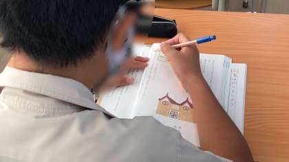 国語の学習です。先生の音読を聴きながら、気になったところに線を引いています。