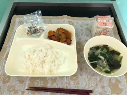今日の献立は、酢豚、中華スープ、アーモンドフィッシュ、ご飯、牛乳です。いただきます。