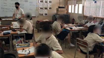 上段が1組、社会科の学習で鎌倉時代の元寇についての話でした。自分が鎌倉幕府の人間だったらどうするかを考えていました。下段は2組、英語の学習で班で話し合いながら進めていました。