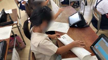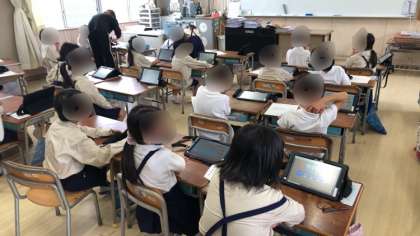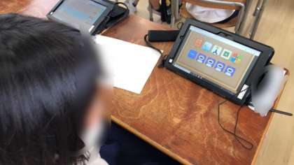 タブレット端末の使い方を学習していました。その後、遠足のしおりを配布していました。