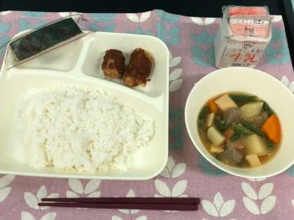 今日の献立は、味噌カツ、じゃがいもと野菜の煮物、焼きのり、ご飯、牛乳です。