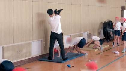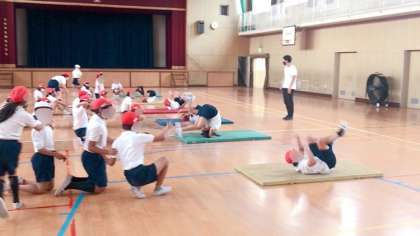 体育でマット運動の学習でした。今まで学習した技のおさらいや壁を使った倒立の練習などに取り組んでいました。