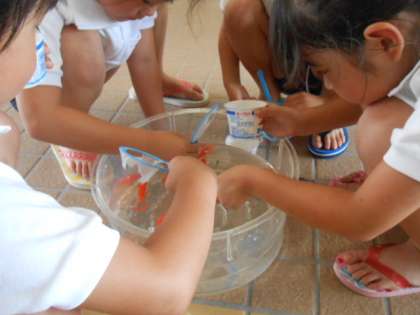子どもたちは、ポイを使って上手に金魚をすくいます。