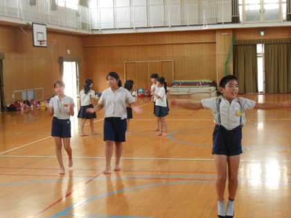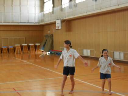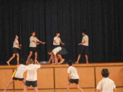 体育館で赤白両方の応援団がダンスの練習をしています。2つの組の踊りが違うようですがその違いに気づくことができませんでした。