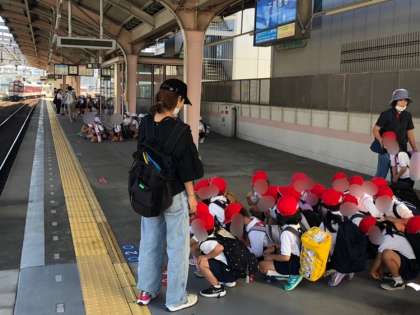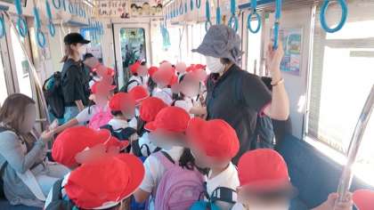 阪神電車に乗って、元浜緑地公園に行きます。電車のホームでも、車内でもとても行儀よく静かです!