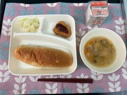 今日の献立は、とんかつのオーロラソースがけ、スープ、あっさりキャベツ、おさつパン