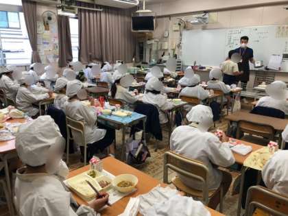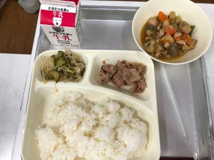 今日の献立は、豚肉のネギ醤油焼き、ふきよせ煮、きゅうりともやしの甘酢和え、ご飯、牛乳です。今も静かに黙食しています。いつになれば、楽しく会食できるのでしょうか。