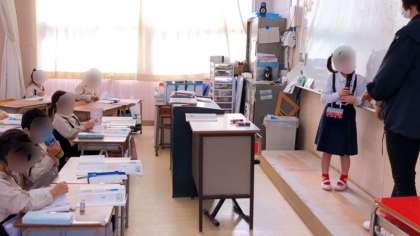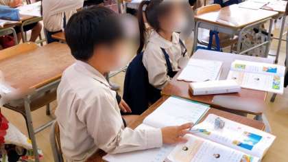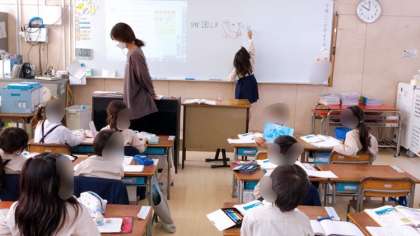 算数の足し算の学習です。7+5の計算の仕方を前で発表していました。友だちの発表をしっかり聞いています。