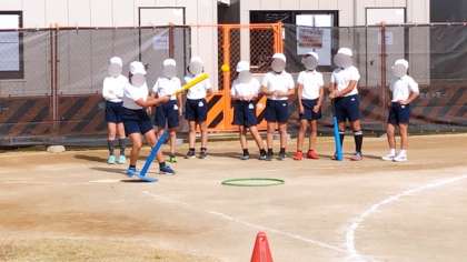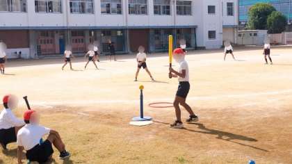 体育でティーボールのゲームをしていました。とても楽しそうです。