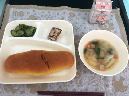 今日の献立は、鰹のマリネ焼き(ノンエッグドレッシング)、ウインナーとじゃがいものスープ、きゅうりのサラダ、パンプキンパン、牛乳です。いただきます。