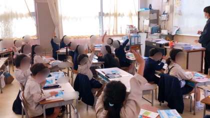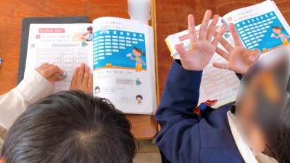 算数の学習です。教科書にある足し算の問題を解いて、答えが11になる式を探していました。たくさんある式を一所懸命解き、11になる式を見つけようと頑張っていました。