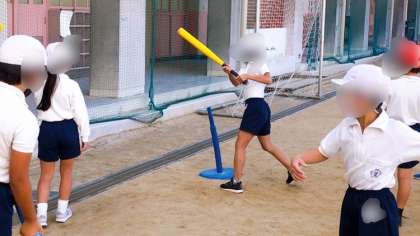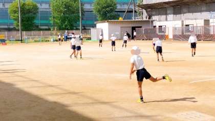 体育の学習です。ティーボールの学習で、チーム練習をしていました。