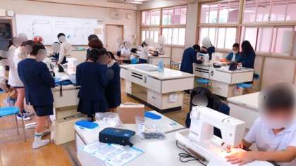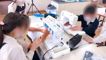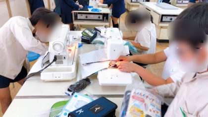 家庭科の裁縫実習です。ナップサックをつくっています。ミシンを使うときはとても集中しています。