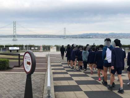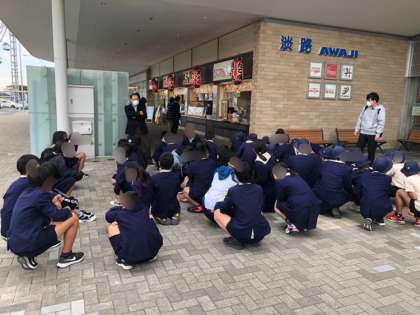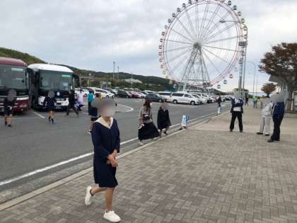 休憩地点の淡路ハイウェイオアシスに着きました。ひどく酔っている子はおらず、皆元気です。ここでトイレ休憩と集合写真を撮る予定です。