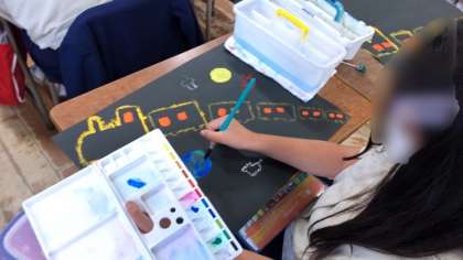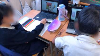 図工の学習です。「銀河鉄道」の絵画ができている人は、タブレット端末で資料を探しながら新聞作りをしていました。