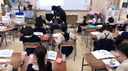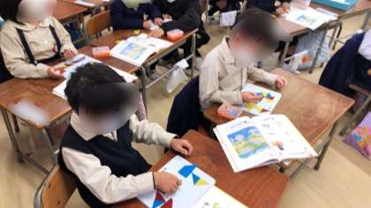 算数の形の学習です。三角や四角のシートを使っていろいろな形を作っていました。