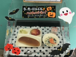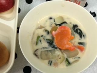 今日の献立は、キノコのクリームシチュー、キャベツのピクルス、りんご、黒糖パン、牛乳です。今日はシチューにハロウィンバージョンのラッキーにんじんが入っています♪