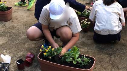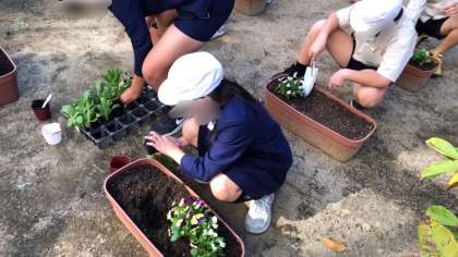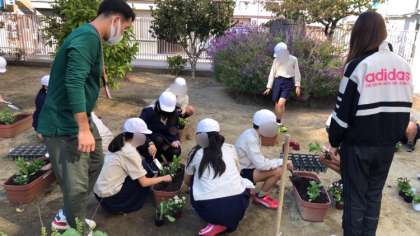 お昼休みを利用して、栽培委員会の人たちが区役所からいただいた花をプランターに植え替えてくれました。開花はこれからみたいですが、玄関が、また、華やかになります♪