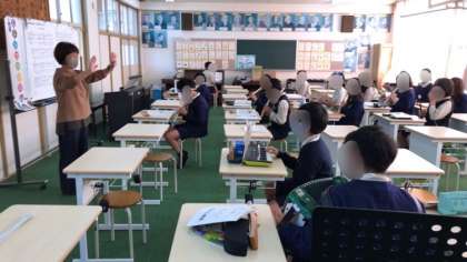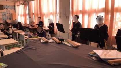 音楽の学習で、合奏曲の練習をしていました。いろんな楽器を使っています。