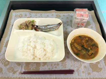 今日の献立は、焼きししゃも、和風カレー汁、舞茸とキャベツの炒め物、ご飯、牛乳です。いただきます。