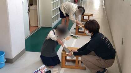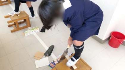 図工の学習です。ノコギリを使う木工です。線に沿って上手く切れるかな、頑張って!