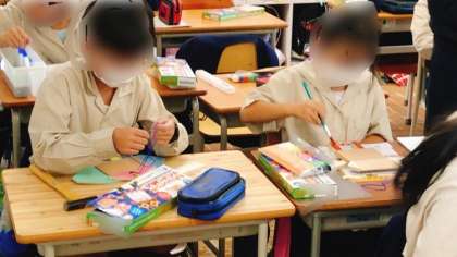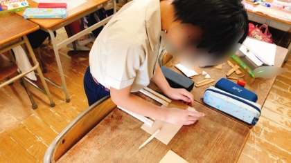 昨日、ノコギリを使って切りとった部品を組み立てて伝言板に仕上げています。この2日間でだいぶできてきました。