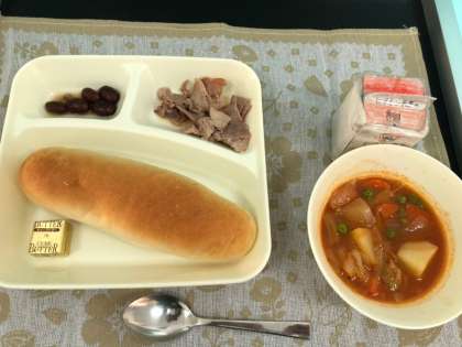 今日の献立は、豚肉のガーリック焼き、ケチャップ煮、うずら豆のグラッセ、コッペパン、バター、牛乳です。いただきます。